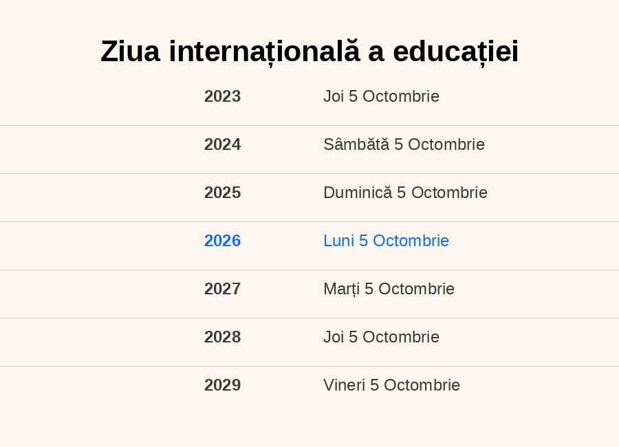 Ziua Mondială a Educației este sărbătorită pe 5 octombrie, este dedicată profesorilor și recunoașterii rolului lor esențial în formarea și educarea generațiilor. Este o zi în care se omagiază eforturile și contribuțiile cadrelor didactice din întreaga lume. Evenimentele și activitățile din această zi subliniază importanța educației de calitate și susținerea profesorilor în munca lor.