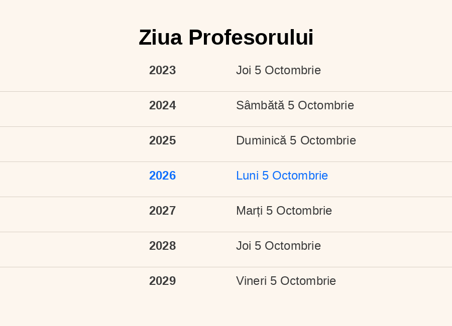 Ziua Profesorului, cunoscută global ca Ziua Mondială a Profesorilor sau Ziua Internațională a Educației, este sărbătorită pe 5 octombrie și are o amploare internațională. Aceasta zi a fost înființată în 1994 pentru a comemora semnarea recomandării UNESCO din 1966 privind statutul profesorilor. Ziua este dedicată aprecierii, evaluării și îmbunătățirii condițiilor profesorilor din întreaga lume, oferind un cadru pentru discutarea și abordarea problemelor din domeniul educației și predării.